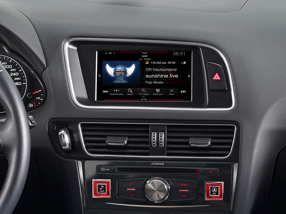All in One Navigation mit 7-Zoll Display für Audi Q5 (8R), Apple CarPlay und Android Auto, USB-Audio-/Video-Wiedergabe mit AVI/MP4/MKV/FLAC/MP3/AAC/WMA, integrierte Navigation mit TMC und 3D-Anzeige, DAB/DAB+/AM/FM-RDS-Tuner, integr. Bluetooth®-Modul mit A2DP u. AVRCP Support, 4x 50 Watt, 3 Pre-Out 4 Volt (opt.), BASS ENGINE PRO/SQ, 6-Kanal-Laufzeitkorrektur, 9-Band-HD-P.EQ, Alpine TuneIt App Ready, HDMI-In/Out, Works with iPhone® & iPod®, 1x A/V-In (3,5 mm Klinke), CAN Bus-Anschluss für Parksensoren-/Klima-anlagen-Interface, OEM Sub-Display mit Navi-Pfeil-Anzeige, Kamera-Direktan-schluss, inklusive komplettes Display-Installations-Set für Q5
