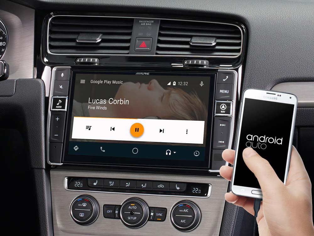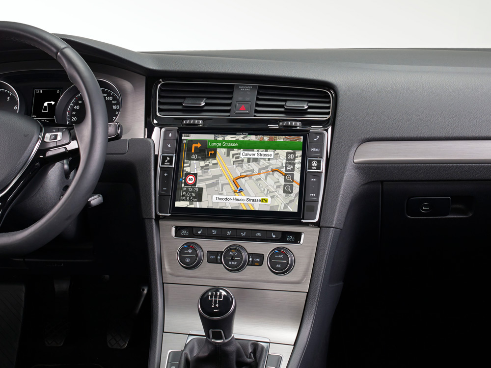 Premium-Infotainment-System mit 9-Zoll Display für VW Golf VII, Apple CarPlay & Android Auto, USB-Audio-/Video-Wiederga- be mit AVI/MP4/MKV/FLAC/MP3/AAC/WMA, integr. Navigation mit TMC und 3D-Anzeige, DAB+ /AM/FM-RDS-Tuner, Bluetooth® -Modul mit A2DP und AVRCP Support, 4x 50 Watt, 3 Pre-Out 4 Volt (opt.), BASS ENGINE PRO/SQ, 6-Kanal- Laufzeitkorrektur, 9-Band-HD-P.EQ, HDMI-In/Out, Works with iPhone® & iPod® , 1x A/V-In (3,5 mm Klinke), CAN Bus- und Lenkradinterface inkl. Parksensoren-/ Klimaanzeige, OEM Sub-Display mit Navi-Pfeil-Anzeige, Kamera-Anschluss für OEM-Kamera