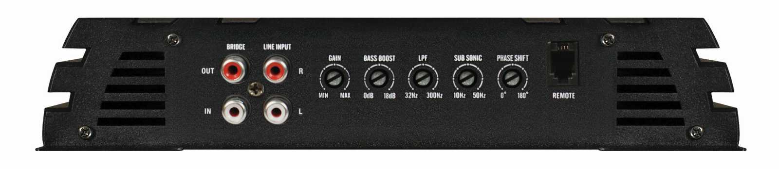 1 x 500 / 800 / 1100 Watt RMS an 4 / 2 / 1 Ohm 1 x 1000 / 1600 / 2200 Watt max. an 4 / 2 / 1 Ohm - Class D Amp - Lowpass 40-150 Hz - Subsonic 10-35 Hz - Bass-Boost 0 - 12 dB - Phase Shift 0-180° - Cinch-Inputs - Master/Slave-Funktion - Bass-Remote - 80% Wirkungsgrad