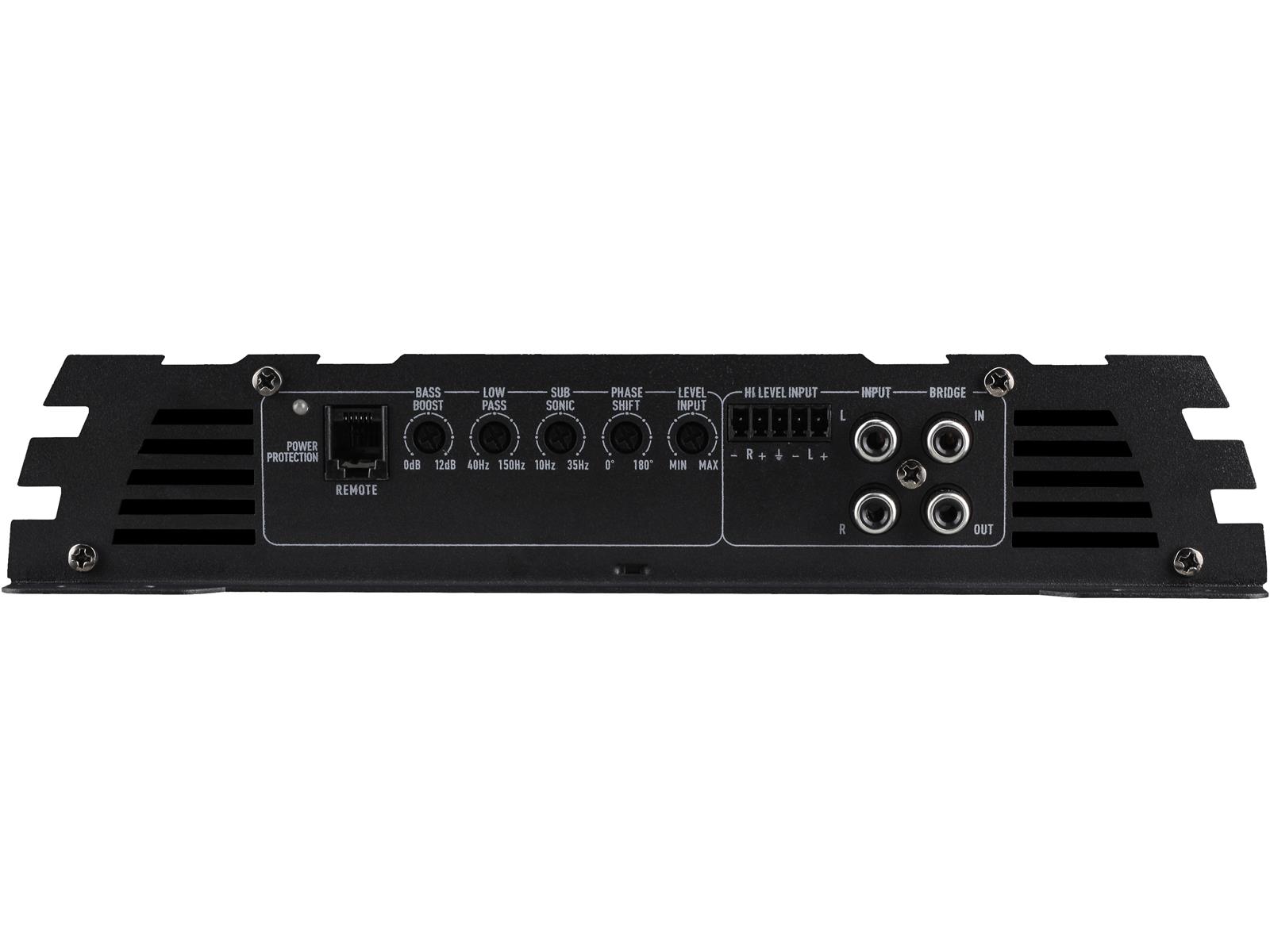 1 x 600 / 1.000 / 1.650 Watt RMS an 4 / 2 / 1 ? 1 x 1.200 / 2.000 / 3.300 Watt max. an 4 / 2 / 1 ? • Class-D Amp • LP 40-150 Hz • Subsonic 10-35 Hz • Bass-Boost 0 - 12 dB • Phase Shift 0-180° • Cinch & High Level Inputs • Auto Turn-On • Master/Slave Modus • Bass-Remote • 87% Wirkungsgrad