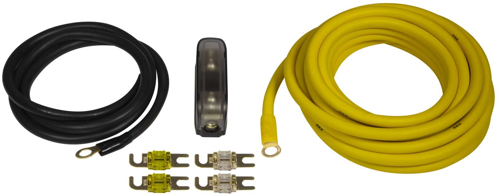 VOLLKUPFER KABELSET - 1 x 16 mm² Stromkabel (gelb) - 5 m - 1 x 16 mm² Massekabel (schwarz) - 1 m - Mini ANL Sicherungshalter - 2 x 80A + 2 x 100A Mini-ANL Sicherung - Install.-Zubehör