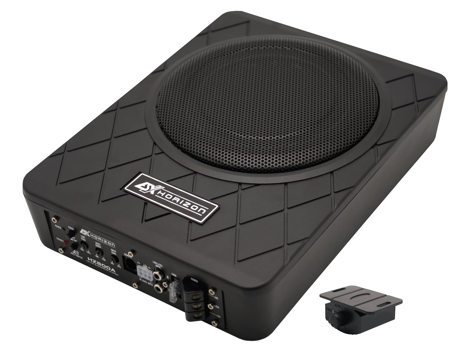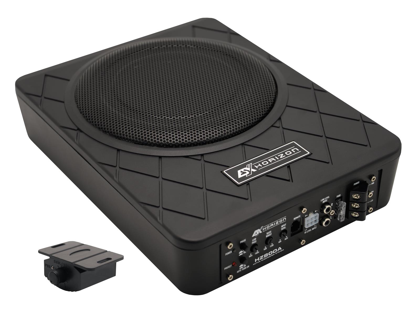 8" (20 cm) Aktiv-Box 100 W RMS / 200 W max. • Lowpass 50-150 Hz • Subsonic 20 Hz • Phasenschalter 0°/180° • Bass-Boost 0-12dB @ 45 Hz • Cinch Inputs • Auto Turn-On via High Level Inputs • inkl. beleuchteter Bass Remote