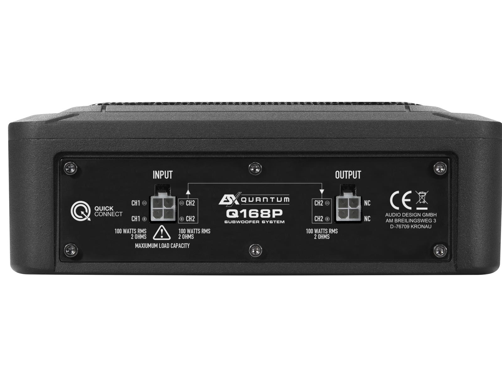 Leistung 100 W RMS / 200 W max. - Impedanz 2 ? - 6x8" (15x20 cm) Woofer - Aluminium Membrane - Aluminium-Gehäuse - 1,4" / 36 mm Schwingspule - inkl. 2 m Quick Connect Anschlußkabel Hinweis: - ein zweiter Q168P kann durch das beiliegende Quick Connect Kabel am "OUT" des ersten Q168P angeschlossen werden.