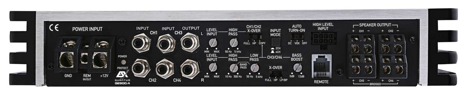 4 x 150 / 225 W RMS @ 4 / 2 ? (Class D) 2 x 450 W RMS gebrückt @ 4 ? • Highpass 50 - 5000 Hz (CH1/2) • Highpass 10 - 500 Hz (CH3/4) • Lowpass 50 - 5000 Hz (CH3/4) • Bandpass-Mode • Bass-Boost 12 dB @ 40 Hz • Copy-Mode (CH3/4 > CH1/2) • Line-Outputs • 2/4 CH Input Mode • inkl. Bass-Remote • Start/Stopp fähig • High Level Inputs mit EPS • Auto Turn-On • Wirkungsgrad 84%