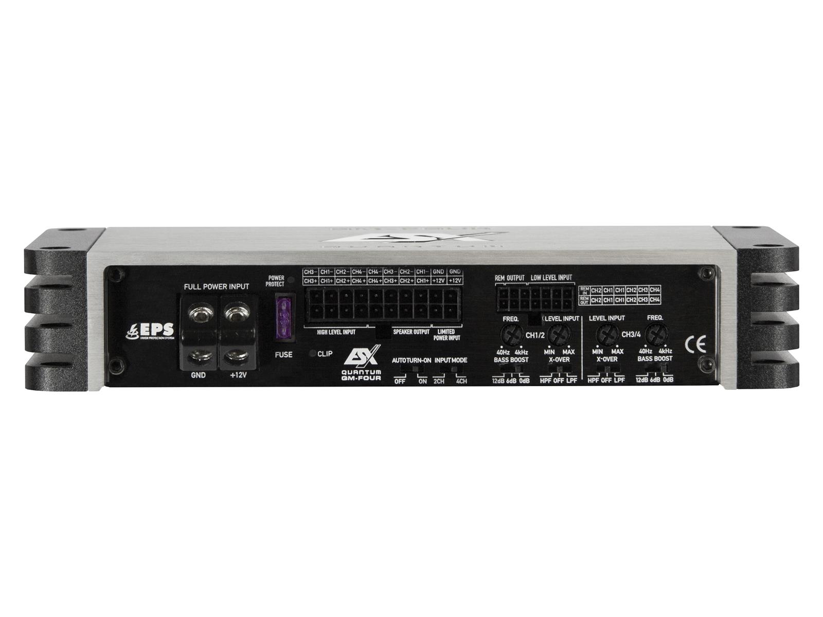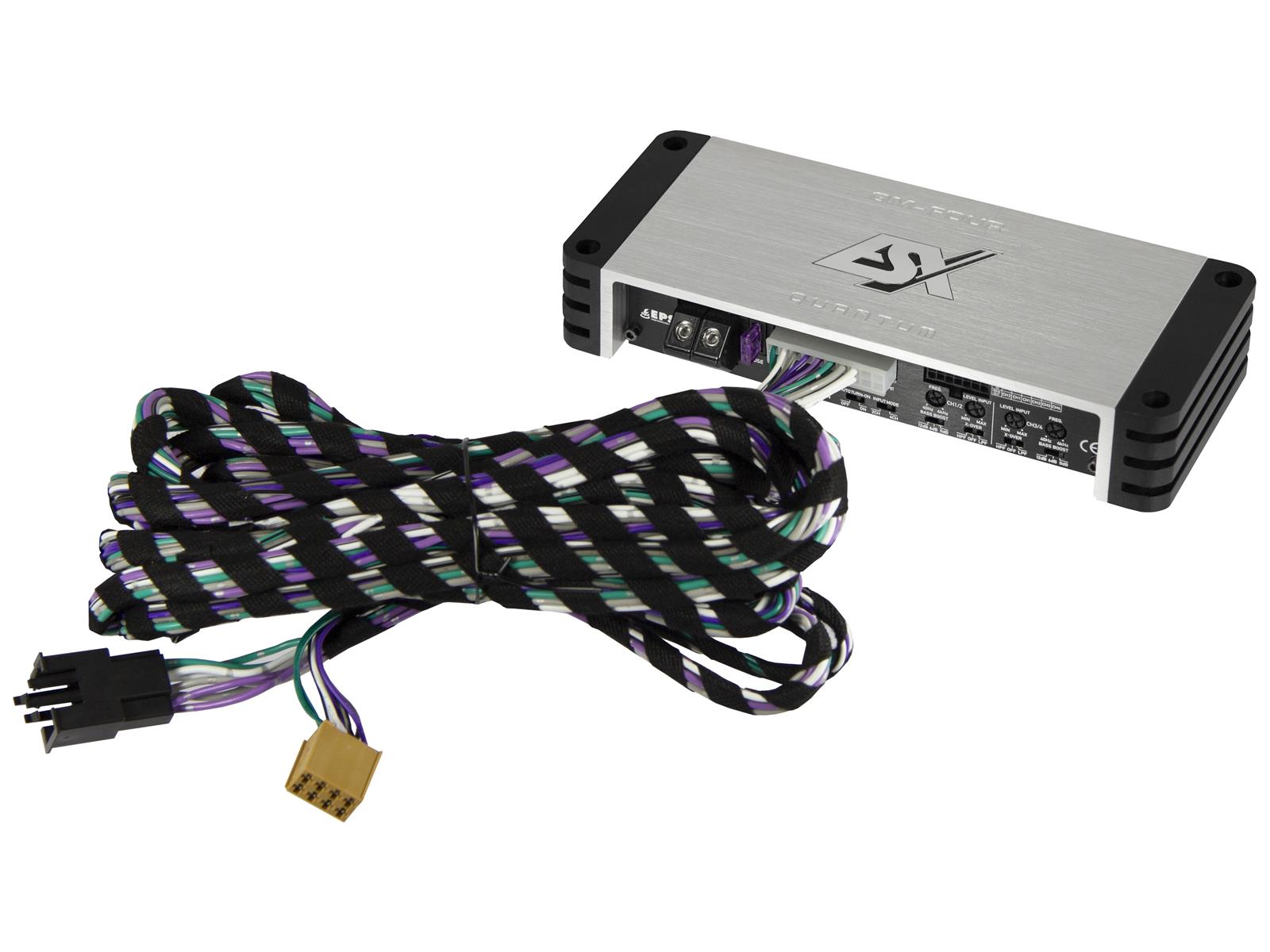 4 x 52 / 90 W RMS @ 4 / 2 ? (Class D) od. 2 x 180 W RMS gebruckt @ 4 ? • Highpass 40-250 Hz • Lowpass 40-250 Hz • Bass-Boost 0 / 6 / 12 dB • Line-Outputs • Clipping LED • High Level Input mit EPS und Auto Turn On • 90% Wirkungsgrad Plug & Play 5 Meter Quadlock Anschlusskabel (kein Strom)