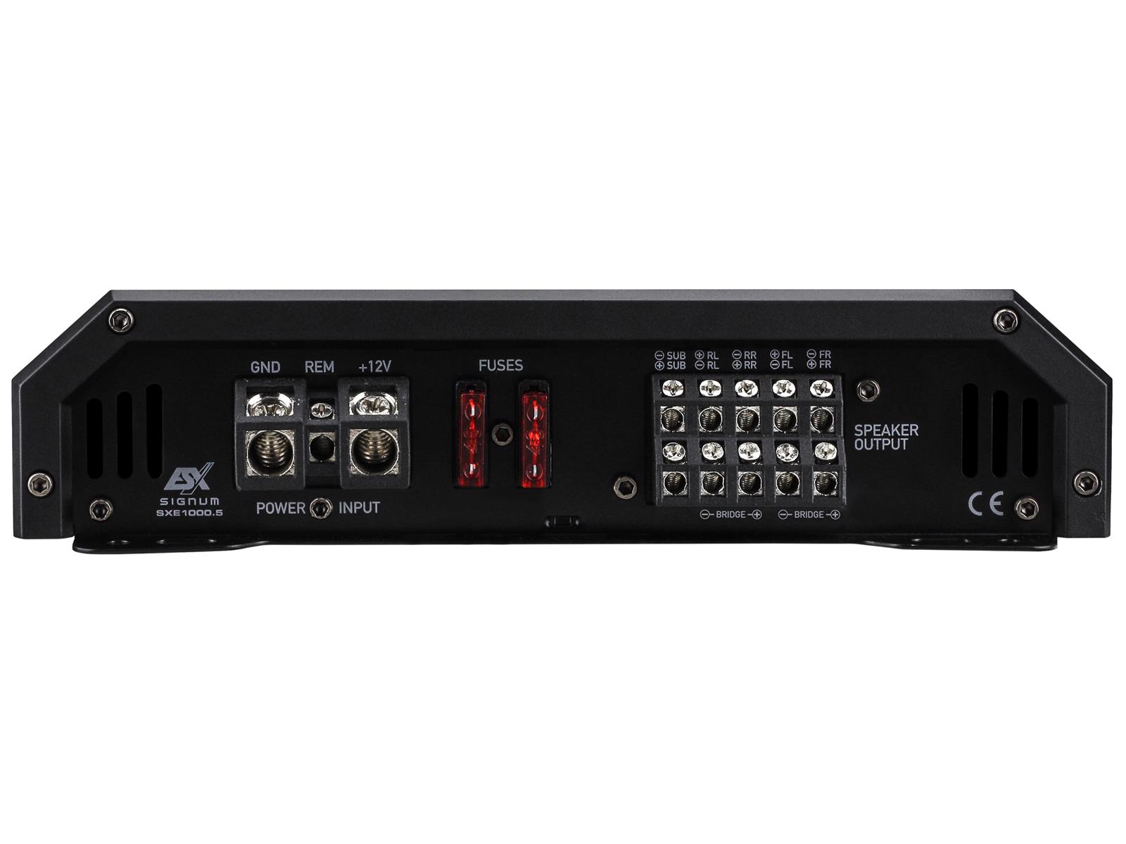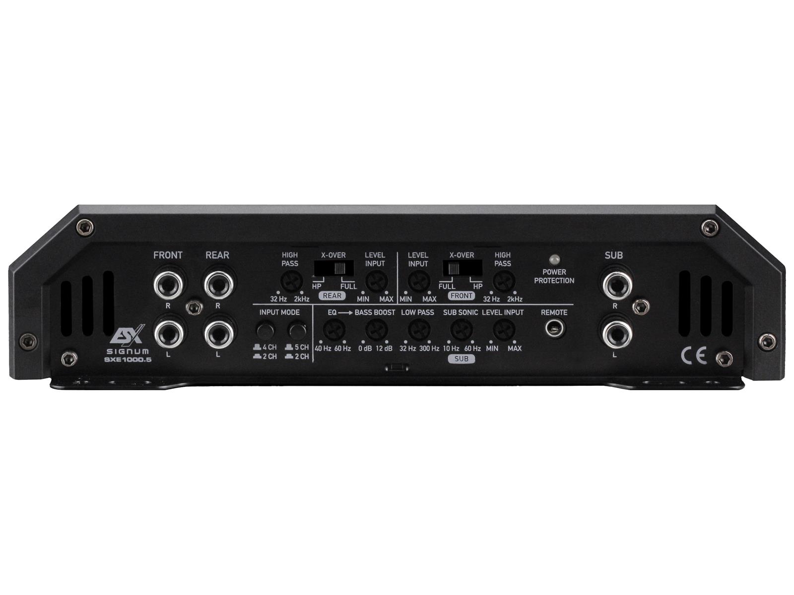 Hybrid 5-Kanal Endstufe mit Class D Subkanal - 4 x 75 / 125 + 1 x 200 / 350 / 500 Watt RMS an 4 / 2 / 1 ? - CH 1-4: Hochpass 32-2000 Hz - CH 2/4/5 Input Mode Schalter - CH 5: Lowpass 32-300 Hz - Subsonic 10-60 Hz - Bass-Remote - Bass-Boost 0-12 dB @ 40 - 60 Hz variabel einstellbar