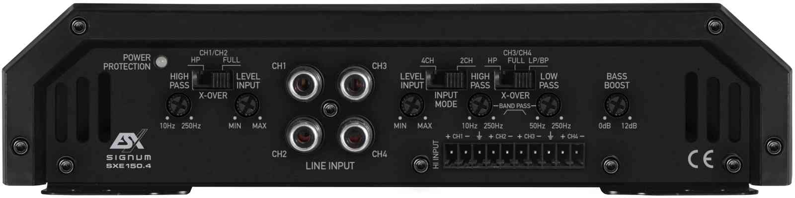 4 x 100 / 150 W RMS @ 4 / 2 ? 2 x 300 W RMS gebrückt @ 4 ? • High Level Inputs mit EPS • Auto-Turn-On • 2 x HP 10-250 Hz • LP 50-250 Hz • Bandpass-Mode • Bass-Boost 0-12 dB (CH3/4) • 62% Wirkungsgrad