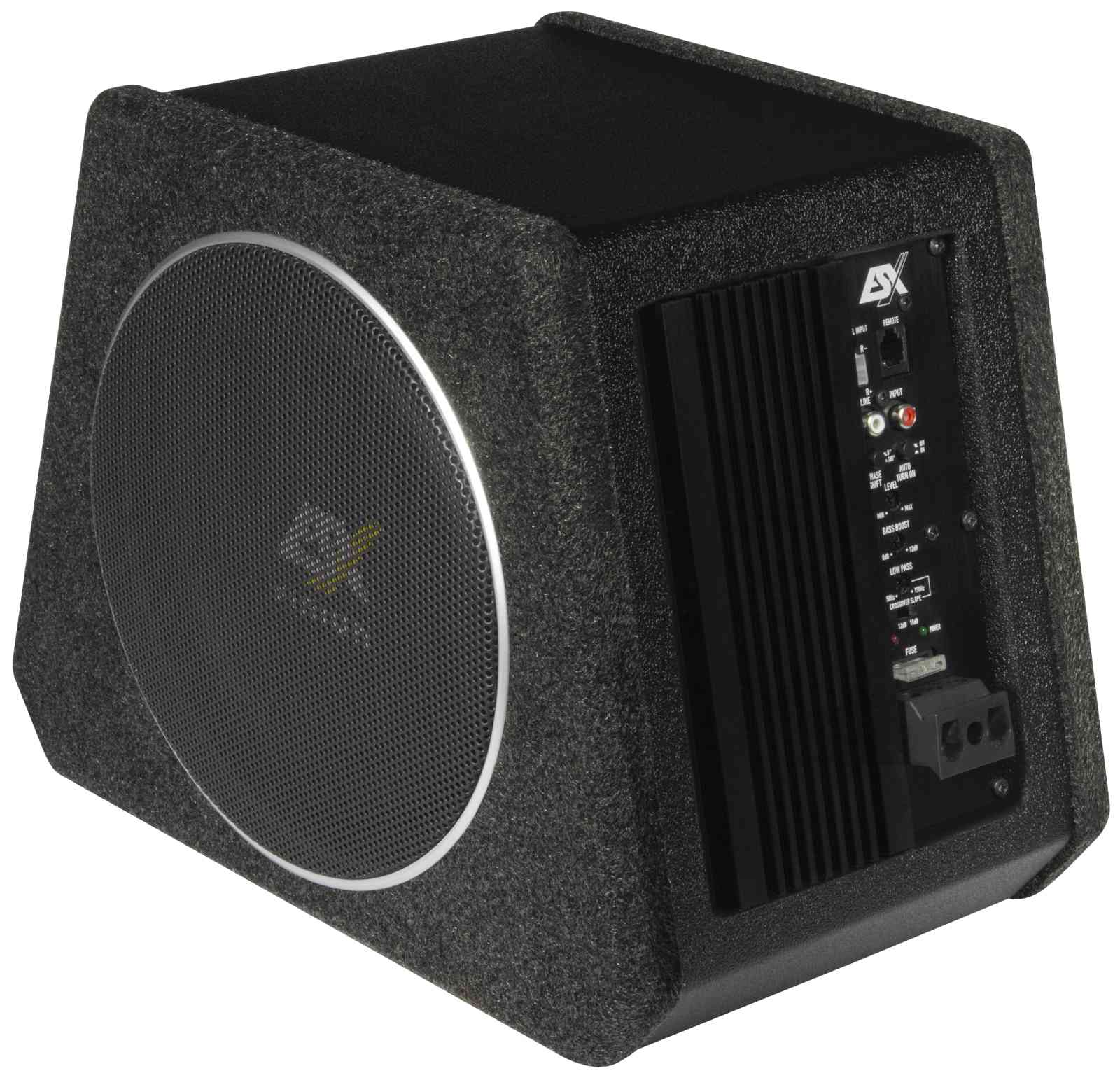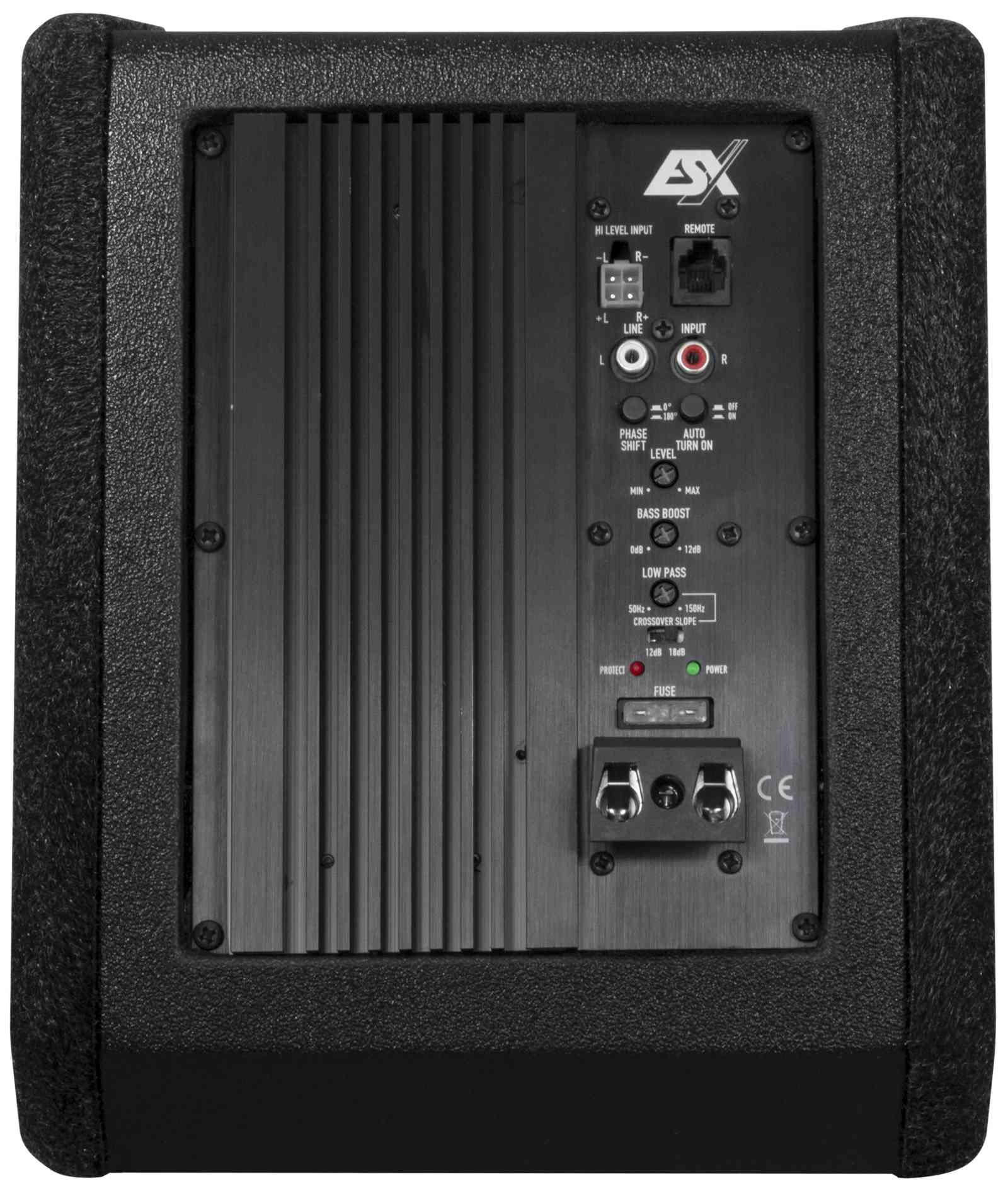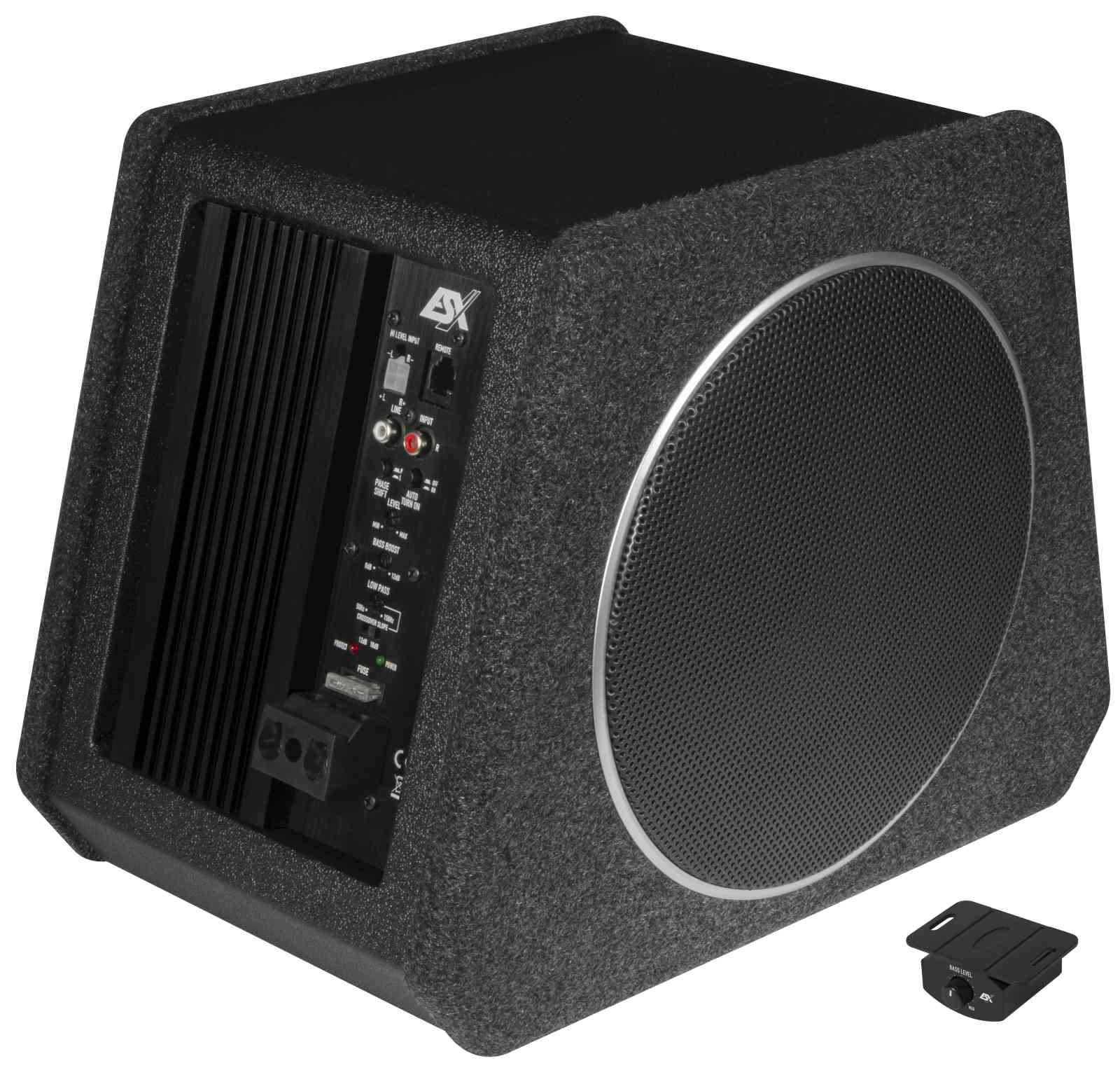 8" (20 cm) Woofer mit Passivmembran - 200 W RMS / 400 W max. - Class D Mono-Verstärker - Wirkungsgrad bis 82% - Lowpass 50-150 Hz - 12/18 dB Flankensteilheit - Phasenschalter 0°/180° - Bass-Boost 0-12 dB @ 45 Hz - Cinch Inputs - Auto Turn-On via High Level Inputs - inkl. Basspegel-Kabelfernbedienung