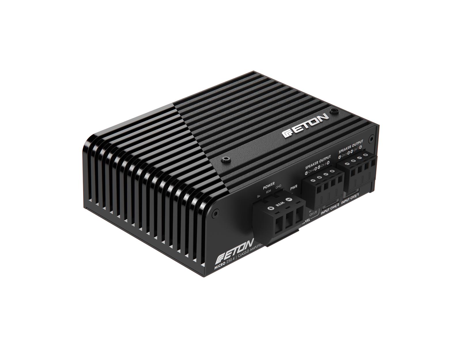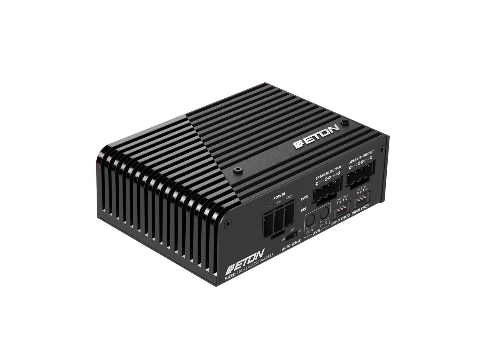 Die bereits bekannte und prämierte ETON MICRO 120.2 2-Kanal Endstufe im Micro-Format erhält Familienzuwachs! Ab April 2022 gibt es sie die kraftvolle 4-Kanal Lösung. Der Problemlöser im ultra kompakten Format wird mit asymme-trischer Leistungsverteilung von 2 x 45 W @ 4 Ohm + 2 x 80 W @ 4 Ohm ausgestattet sein. High- & Low-Pass Filter im Frequenzbereich zwischen 50 Hz und 5000 Hz mit 12 dB Flankensteilheit, getrennt einstellbare Levelgains zwischen 8 und 0.45 V, Auto-Sense On Funktion (SIG / DC Erkennung), Hi- & Lo-Level Input und die Eignung für Fahrzeuge mit Start-Stopp Automatik, runden den Austattung ab. Ultra kompakte 4-Kanal Class-D Verstärkertechnologie mit den Mini-malmaßen von gerade einmal 127 x 94 x 42 mm (LxBxH)! Engineered in Germany – In Sound We Trust.