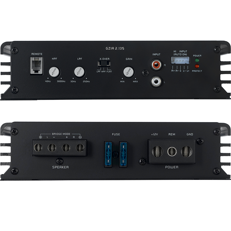 High-Quality Verstärker 2-Kanal Verstärker mit Class A/B Schaltung, integrierter Aktivweiche und schwarz eloxiertem Kühlkörper 2-Kanal Leistungsverstärker Class AB Technologie Variable Aktivweiche und Bass Boost Stabiles Netzteil Großzügig dimensionierte Anschlüsse Schwarz eloxierter Kühlköper mit Ground Zero Schriftzug Hochpegel-Eingang mit Auto-On Funktion Kanäle 2 Ausgangsleistung (@ 4?) 2x 85 Watt RMS Ausgangsleistung (@ 2?) 2x 135 Watt RMS max. Ausgangsleistung (CEA-2006A / 10%THD+N) 300 Watt Ausgangsleistung (@ 4?) gebrückt 260 Watt RMS Frequenzgang: 10 Hz - 30 kHz HPF / LPF Hochpegeleingang / Auto-on Fernbedienung optional Abmessungen (B x L x H)192 x 214 x 49 mm