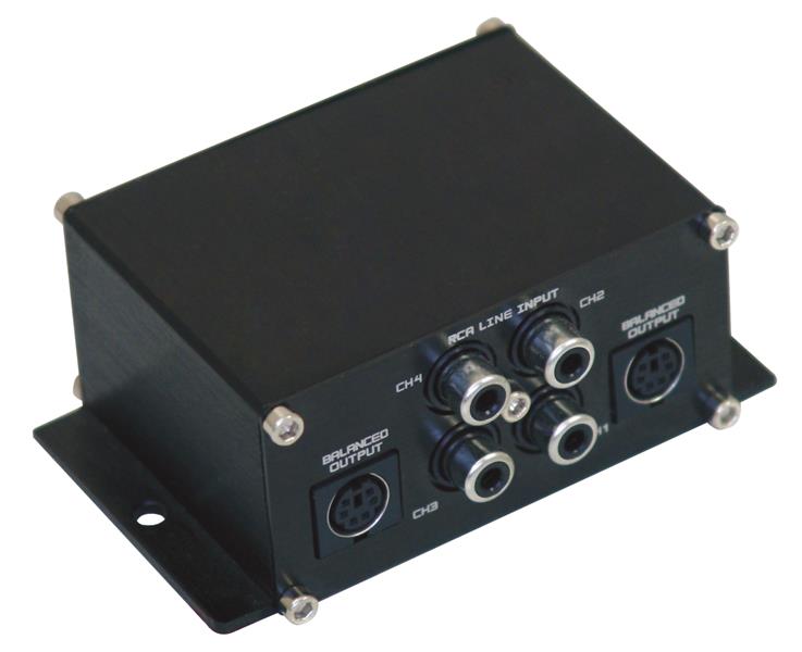 Für 4-Kanalverstärker • justierbarer Eingangspegel • Eingänge Cinch • Ausgänge DIN symmetrisch • Incl. 2 x 5 m Kabel • für alle HiFonics/Crunch Verstärker mit Balanced-Line Inputs