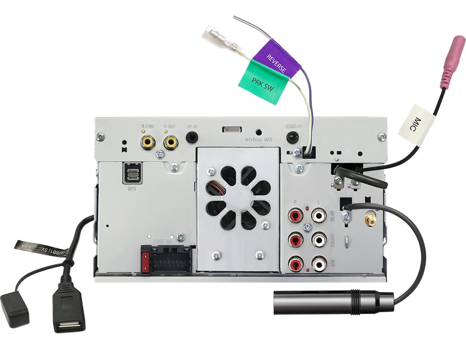 - Eingang für Rückfahrkamera, ein AV-Eingang, ein Videoausgang