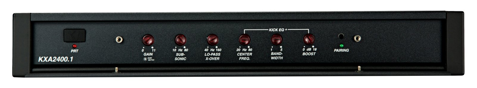 1 x 1.200 / 2.400 / 2.400 Watt RMS an 4 / 2 / 1 ? • LP 40-160 Hz (24dB) • Subsonic 10-80 Hz (24dB) • KickEQ+ Boost 0-18 dB 20-80 Hz • Line Outputs • Highlevel Input • Auto Turn on (Audio / DC Offset) • incl. Wireless Bass-Remote KXARC
