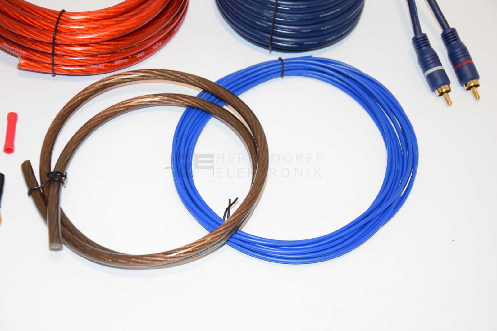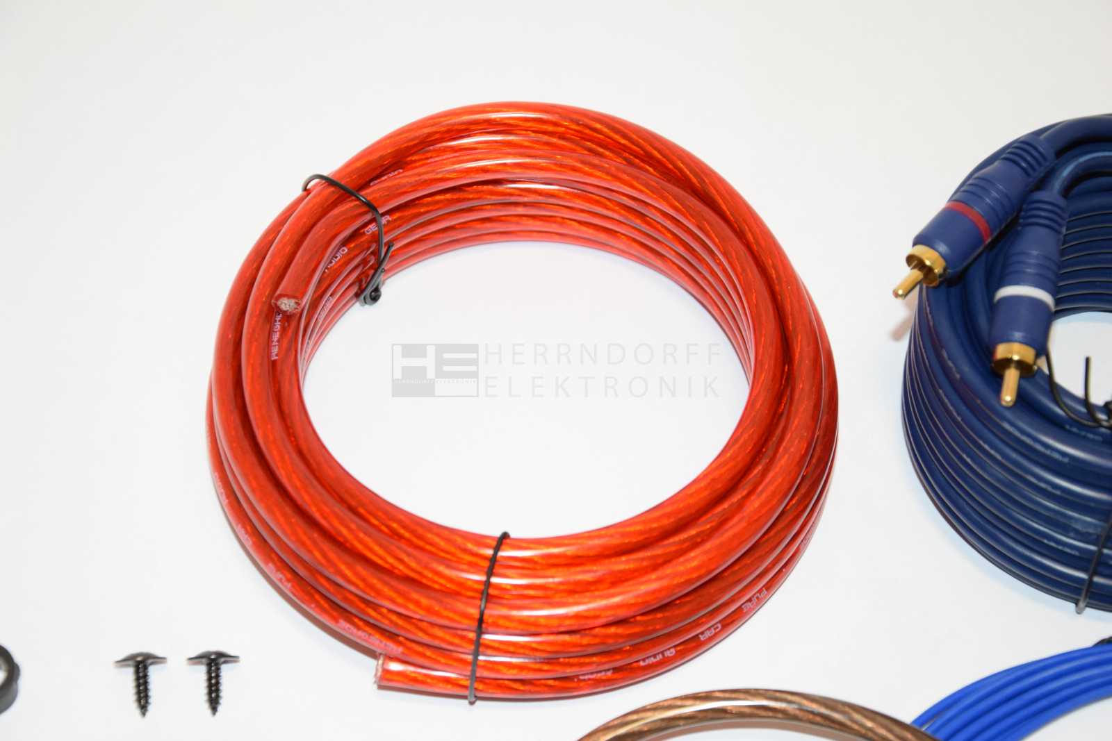 - 1 x 10 mm² (0,15er Aufbau) Stromkabel (rot) - 5 m - 1 x 10 mm² (0,15er Aufbau) Massekabel (grau) - 0.8 m - 1 x 5 m doppelt abgeschirmtes Cinch Kabel (blau) - 1 x 0,5 mm² Steuerleitung 5 m - Installationszubehör - 1 x AFS Sicherungshalter mit 40A Sicherung