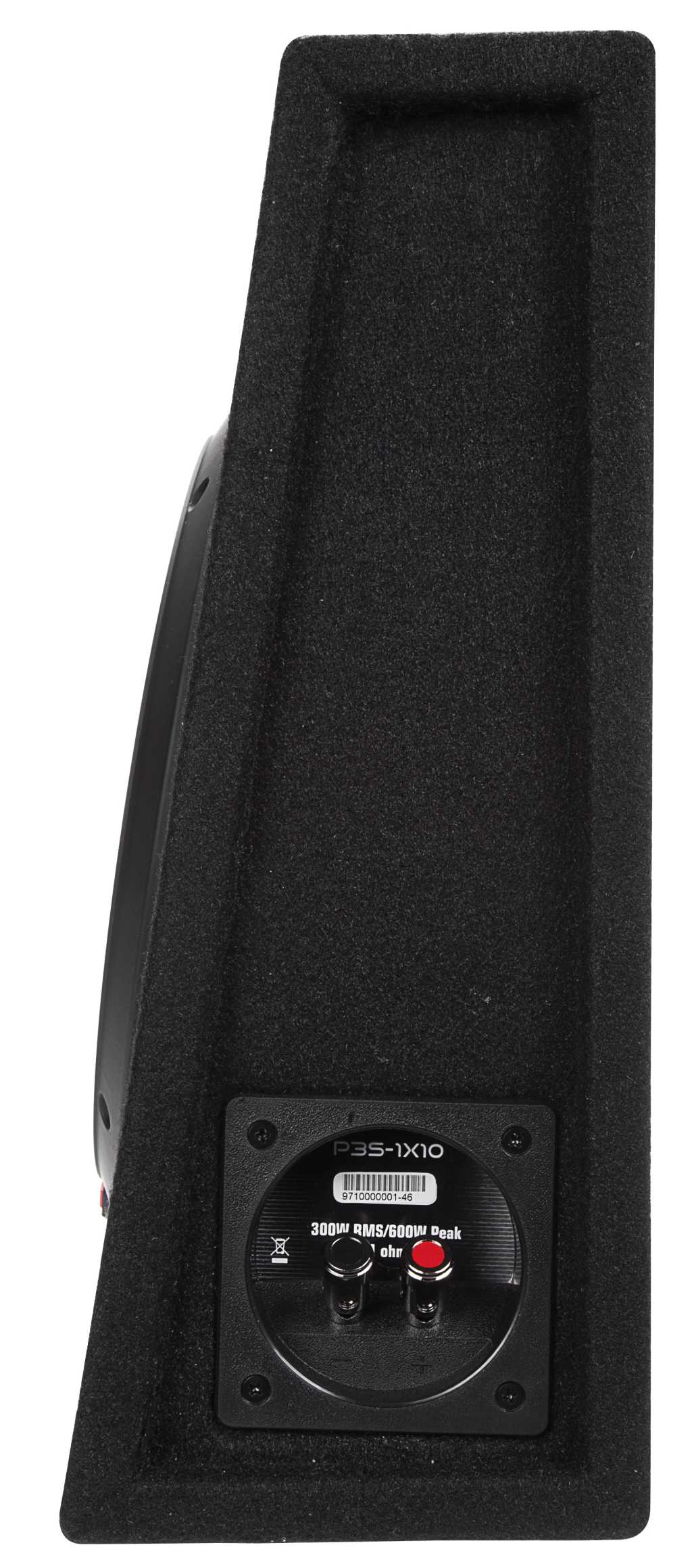Leistung 300 / 600 Watt - Impedanz 1 ? - 10" (25 cm) Single-Subbox - ultraflach - hochwertigem schwarzem Teppichbezug - 1 x P3SD2-10 Woofer (2+2 ?) mit 2.5" (64 mm) VC - Umrüstung von 1 auf 4 ? möglich