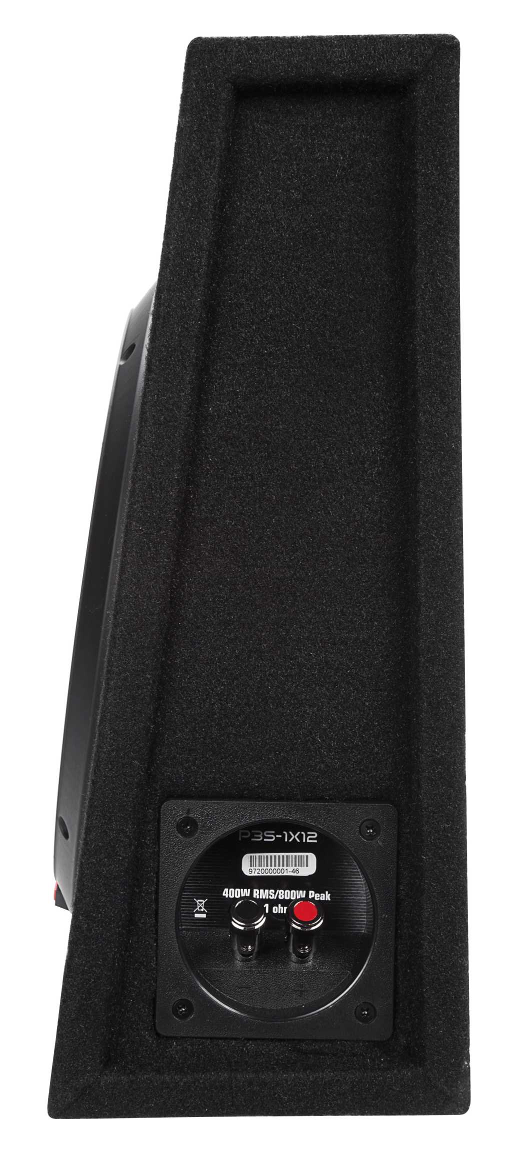 Leistung 400 / 800 Watt - Impedanz 1 ? - 12" (30 cm) Single-Subbox - ultraflach - hochwertigem schwarzem Teppichbezug - 1 x P3SD2-12 Woofer (2+2 ?) mit 2.5" (64 mm) VC - Umrüstung von 1 auf 4 ? möglich