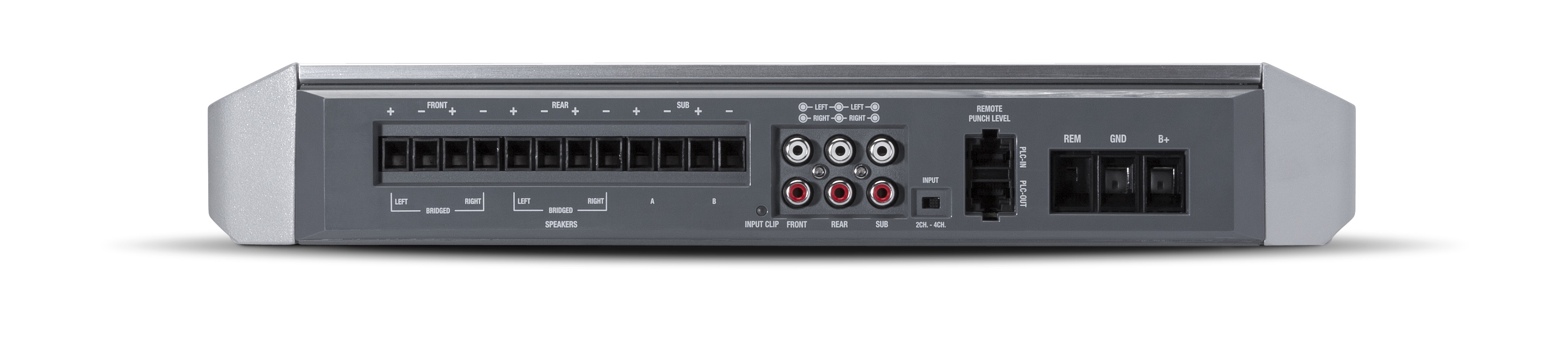 4 x 75 / 125 Watt RMS @ 4 / 2 ? (analog) + 1 x 150 / 300 / 500 Watt RMS @ 4 / 2 / 1 ? (digital) • HP/LP 50-250 Hz • CH5: LP 50-250 Hz • 28 Hz Subsonic Filter • 0-18 dB Bass Boost • 2/4 CH Input Select • High Level Inputs mit Auto Turn On • C.L.E.A.N.-Setup • Optional PLC2 Bass-Remote • Inkl. Leistungszertifikat • AP-Power*: 4 x 106 / 171 + 1 x 279 / 496 / 763 Watt RMS