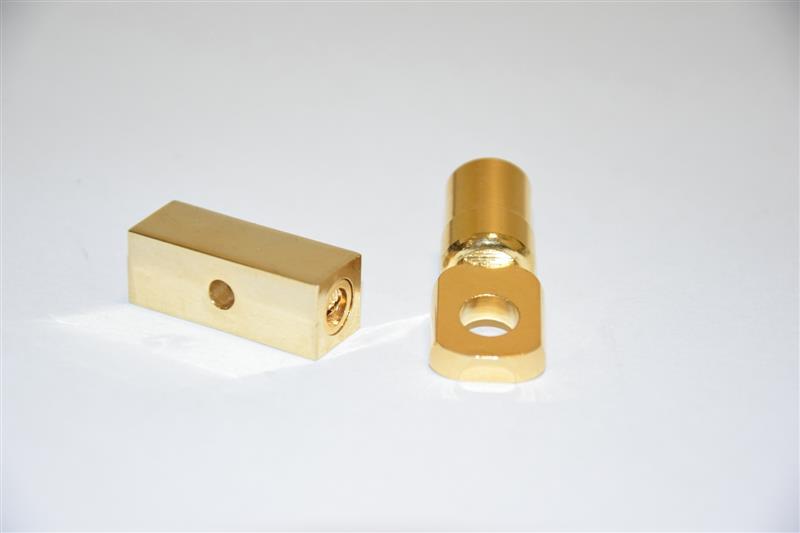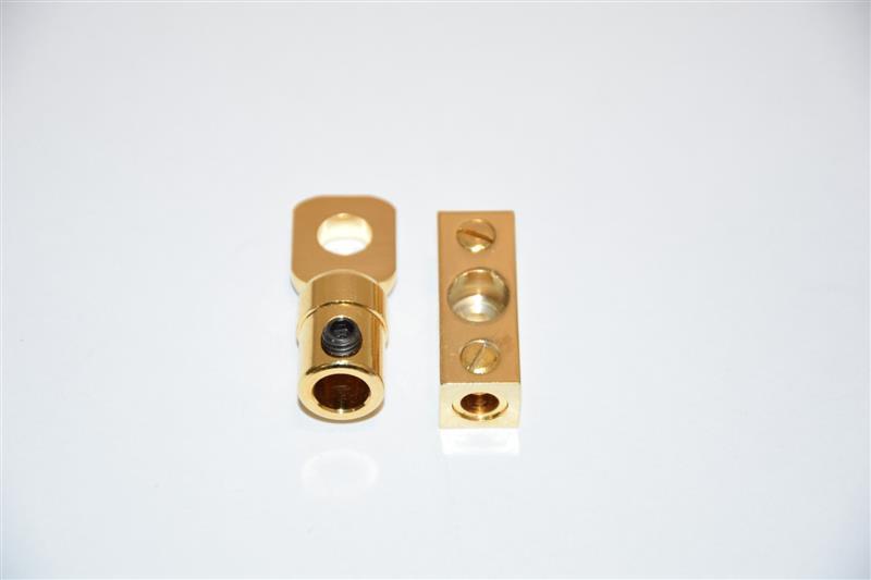Diese Kabelschuhe sind sehr vergoldet. Die Vergoldung dient in erster Linie einen guten Korrisionschutz zu bieten. So bleibt immer eine gute Leitfähigkeit der Verbinder gesichert. Die massive Ausführung bietet einen sehr sicheren Kabelverbund durch Verschraubungen. Der Ringkabelschuh nimmt Kabel bis zu 25mm² Querschnitt auf. Der Masseblock, der an der Karosserie des Fahrzeugs befestigt wird, kann 2 Kabel mit einem Querschnitt bis zu 25mm² aufnehmen. Es sind Verjüngungshülsen im Lieferumfang falls z. B. Kabel mit einem Querschnitt von 6 oder 10mm² installiert werden sollen.